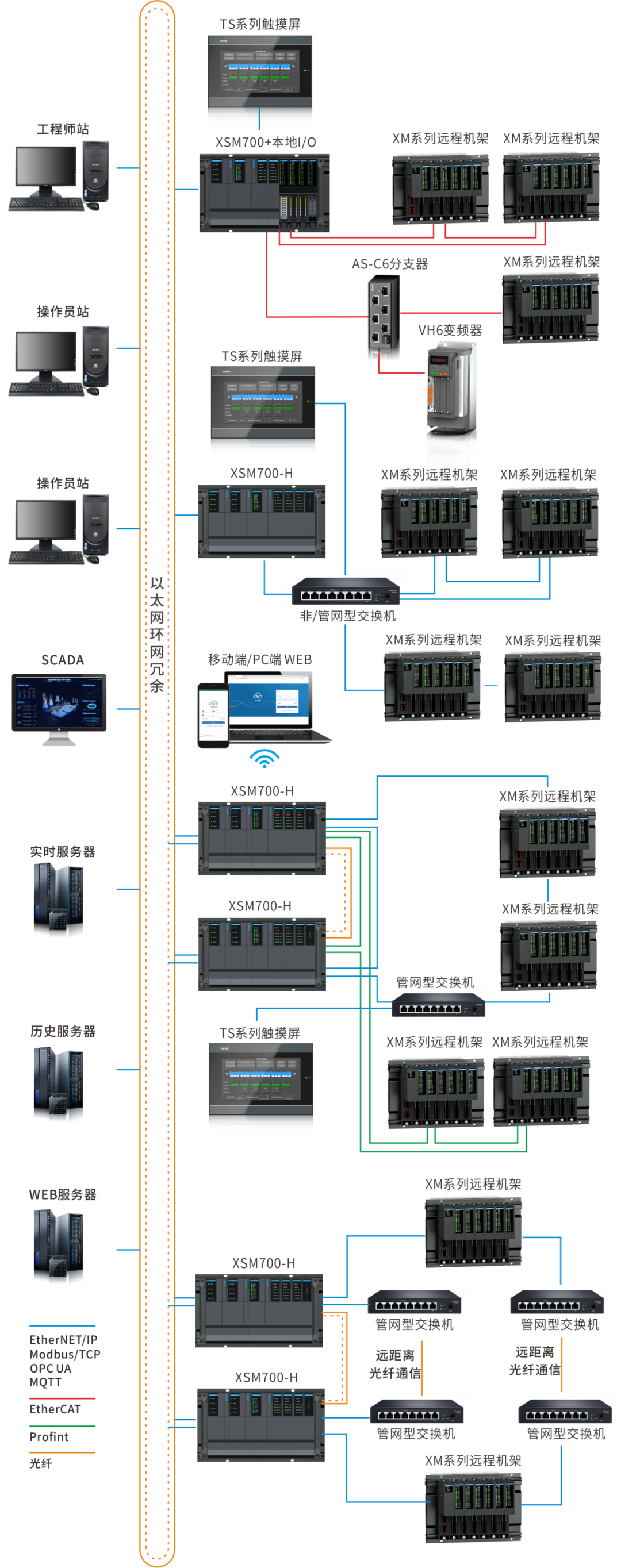 信捷最新推出的XM系列中大型PLC,正是这一战略的核心。该系列深入聚焦高可靠性需求,采用全冗余架构设计,支持电源、控制器、网络等多重冗余保障,冗余切换时间低至20毫秒,大幅提升系统可用性。