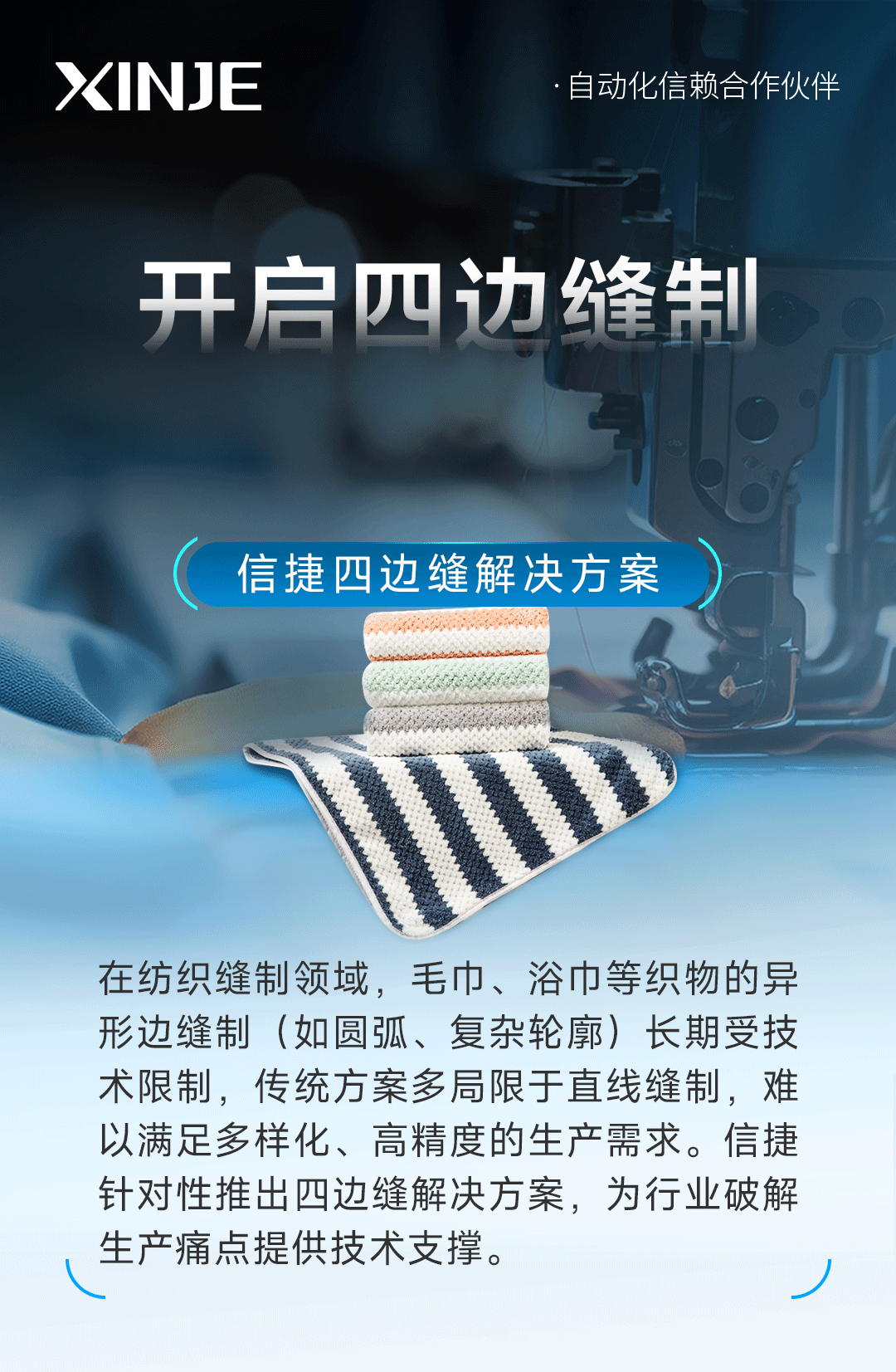 开启四边缝制新 “净” 界丨信捷四边缝解决方案在纺织缝制领域,毛巾、浴巾等织物的异形边缝制(如圆弧、复杂轮廓)长期受技术限制,传统方案多局限于直线缝制,难以满足多样化、高精度的生产需求。信捷针对性推出四边缝解决方案,为行业破解生产痛点提供技术支撑。